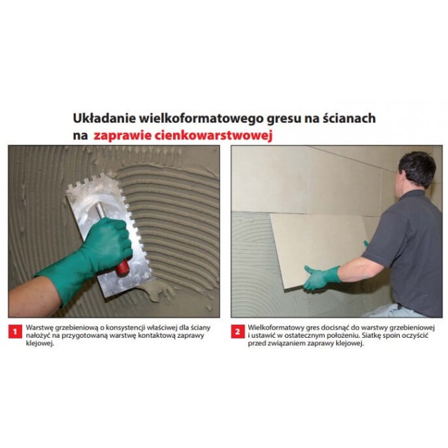 Рекомендуется для укладки крупноформатного керамогранита на стены и полы. Пригоден для облицовки гидроизоляции и полов с подогревом. В зависимости от назначения, консистенция клея может меняться от среднеслойной до полутекучей.  Низкое содержание соединений хрома согл. Директиве ЕС 2003/53/ЕС.